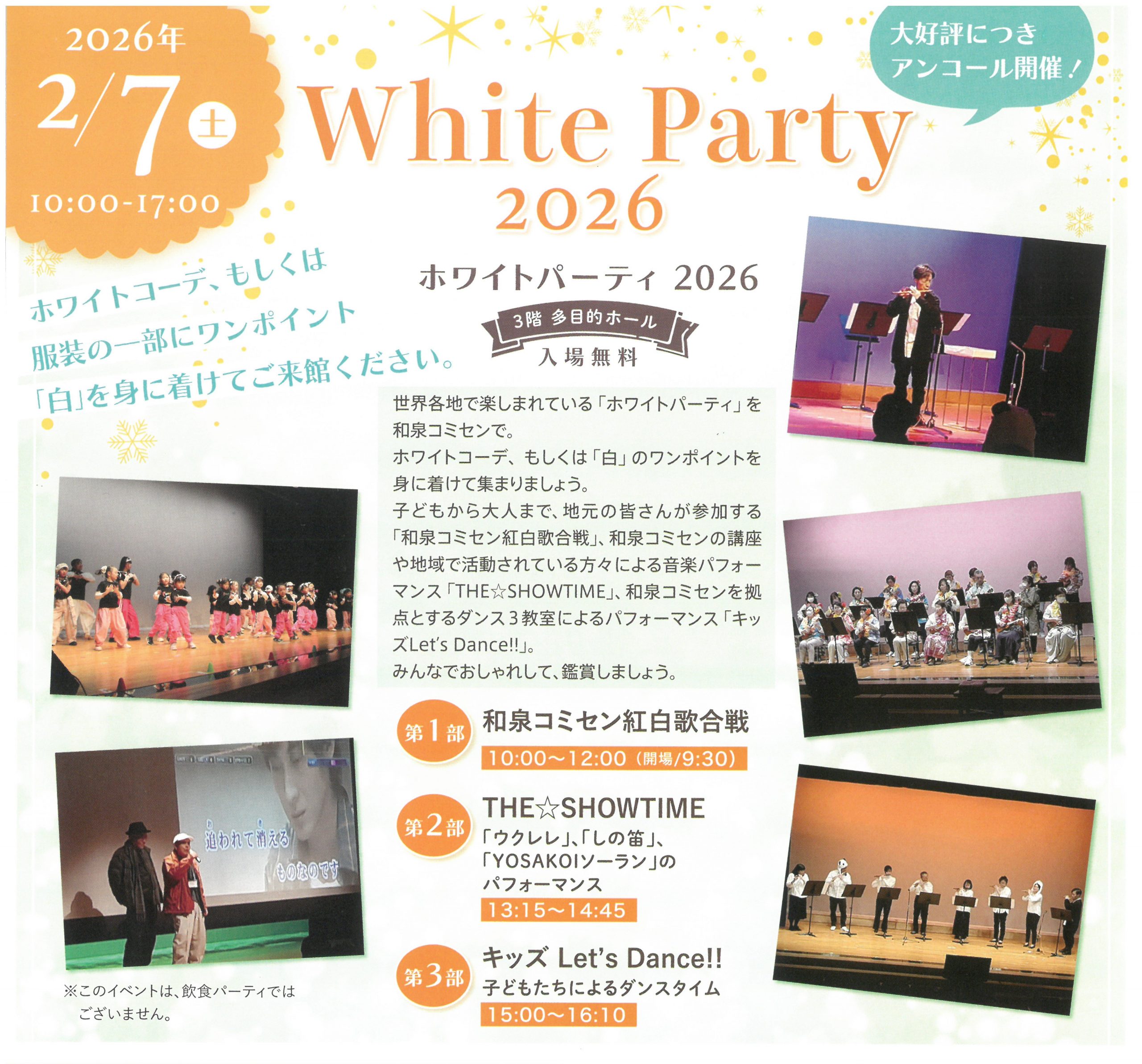 ホーム お知らせ 2026 ホワイトパーティー in 和泉コミセン 開催! 2026 ホワイトパーティー in 和泉コミセン 開催! (投稿日:2026年01月29日) 一覧へ戻る お問い合わせ 電話 :0725-43-0532 Eメール :info@izumi-komisen.jp お問い合わせはこちら